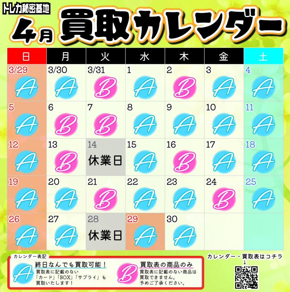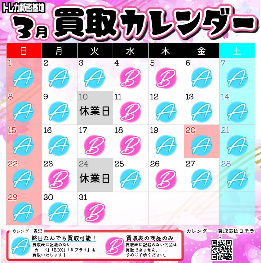 最新!買取情報 更新日 2026/3/31 ※終日買取可能日でも、当日の混雑状況により急遽買取停止となる場合や、査定担当の状況により急な予定変更がある可能性がございます。 ※在庫状況により予告なく買取額変更となる場合がございます。